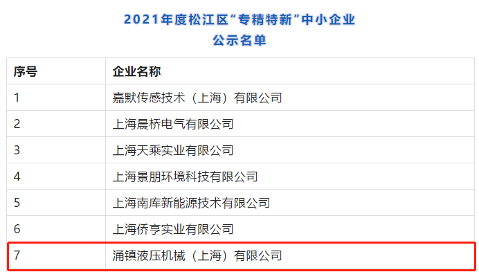 《松江區(qū)“專精特新”中小企業(yè)發(fā)展專項支持實施細則(2020年版)》(滬松經(jīng)〔2020〕165號),區(qū)經(jīng)委組織開展了2021年度松江區(qū)“專精特新”中小企業(yè)申報和復核工作。涌鎮(zhèn)液壓充分發(fā)揮自身優(yōu)勢,堅持獨立自主的研發(fā)與創(chuàng)新設(shè)計,憑借高效的產(chǎn)品創(chuàng)新能力和廣泛的市場認可度,成功申報并獲得上海市松江區(qū)“專精特新”的稱號。